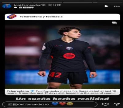 上演巴萨首秀!16岁托尼费尔南德斯社媒晒照:梦想成真