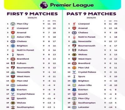 体育资讯12月28日报道宣称 英超官方社交媒体晒出了英超本赛季前9轮积分和近9轮积分的对比,曼城从榜首一下子来到了降级区,表现堪称天壤之别。