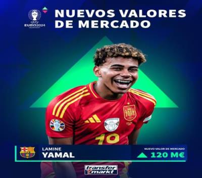 体育资讯07月18日报道宣称 欧洲杯结束后,德转对部分球员的身价进行了更新,其中17岁的亚马尔身价涨至1.2亿欧,成为新晋亿元先生!