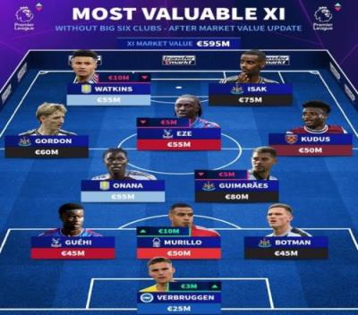 体育资讯12月18日报道宣称 《转会市场》在近日更新了英超球员身价榜,并列出了一套非BIG6球员最贵阵,纽卡4将在列。