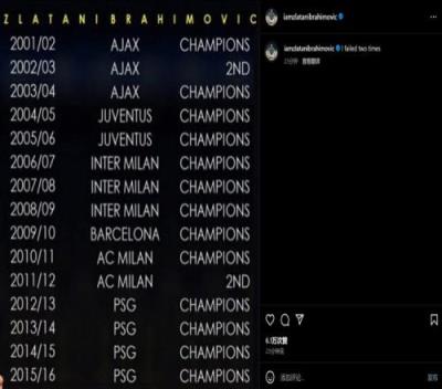 体育资讯1月24日报道宣称 伊布更新了社交媒体,晒出自己曾经的辉煌战绩。