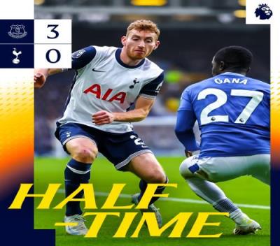 上半场最后阶段,格雷打入乌龙,热刺客场0-3落后埃弗顿↓