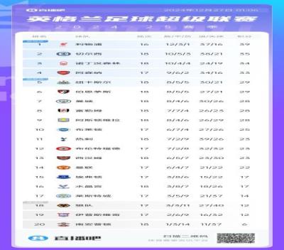 体育资讯12月27日报道宣称 英超本轮结束多场对阵,最新积分榜情况如上图。