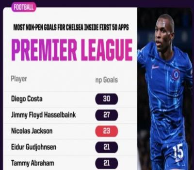 值得一提的是,另一位上赛季才加盟的新援帕尔默也已经为切尔西出战了49场英超,非点球进球数为21球。德罗巴和克雷斯波这两大神锋同期的非点球进球数则是20球。