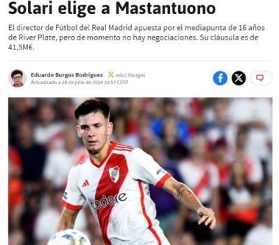 阿斯报:河床为马斯坦托诺定价4150万欧,皇马还没正式开启谈判