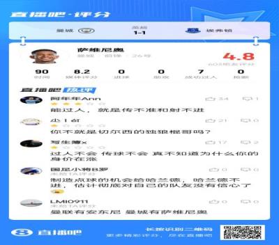 英超第18轮,曼城1-1战平埃弗顿。萨维尼奥本场比赛首发踢满全场,赛后被吧友打出4.8分的低分。