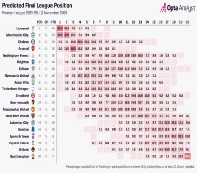 体育资讯11月11日报道宣称 英超第11轮比赛战罢,Opta超级计算机评估了本赛季英超各支球队的可能排名,利物浦有60.3%的概率获得冠军,是20支球队中夺冠概率最大的。