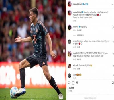 帕利尼亚也晒出自己的比赛照,并配文:“在首场正式比赛开战前的一次很棒的测试!很高兴能为拜仁打进我的首粒进球。感谢球迷们的支持。”