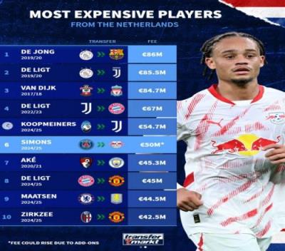 荷兰球员转会费榜:德容居首,西蒙斯在列,德里赫特三度上榜