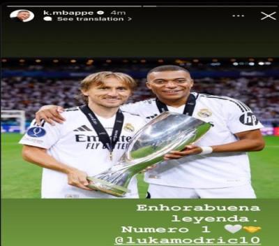 本场比赛姆巴佩首秀破门,莫德里奇则收获皇马生涯第27座冠军,成为队史最多。赛后姆巴佩在个人社媒晒出与莫德里奇合影,配文写道:“祝贺传奇,Number one!”