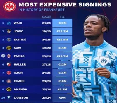 体育资讯1月25日报道宣称 在以7500万欧出售马尔穆什之后,法兰克福迅速引进了法国前锋瓦希,《转会市场》也统计了法兰克福队史引援榜情况。