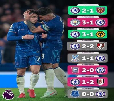 英超官方晒出了切尔西近8场英超比赛的战绩,8场比赛蓝军仅取胜2场,具体战绩2胜3平3负。