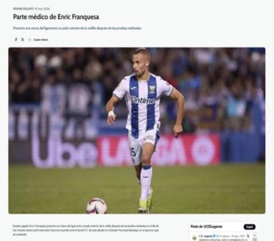 体育资讯11月11日报道宣称 西甲莱加内斯官方宣布,球队后卫弗兰克萨经检查确认膝盖前十字韧带撕裂。