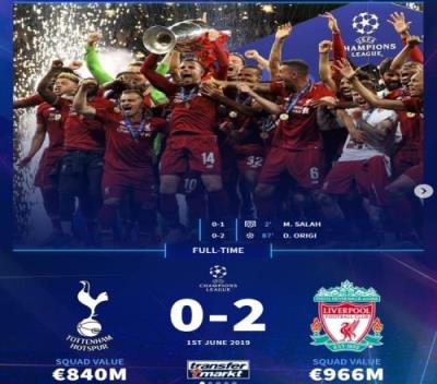 2019年6月,欧冠决赛:热刺0-2利物浦,此前长期受伤的凯恩火线复出表现不佳,萨拉赫开场闪击、奥里吉锁定胜局。