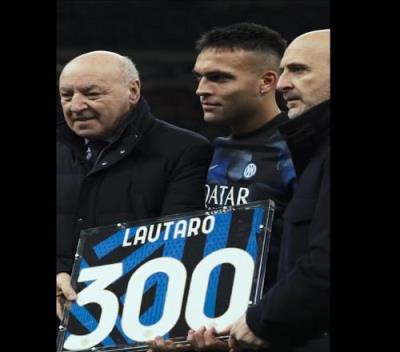 劳塔罗此前在欧冠对阵勒沃库森时已经迎来了在国米的第300场正式比赛,他在今天赛前从国米主席马洛塔和总监奥西利奥手中收到了300场纪念球衣。