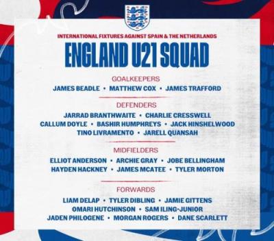 体育资讯11月8日报道宣称 英格兰U21最新一期名单公布,布兰斯维特、乔布-贝林厄姆、宽萨、阿奇-格雷、麦卡蒂、莫顿等球员入选。本月英格兰U21将与西班牙、荷兰交手。