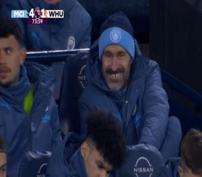 体育资讯01月05日报道宣称 曼城4-1击败西汉姆,奥尔特加受伤接受治疗时,转播镜头给到了看台上、39岁的替补门将斯科特-卡森。