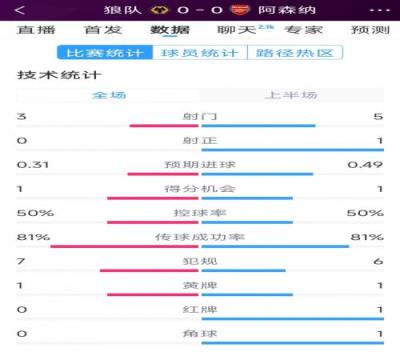 体育资讯1月25日报道宣称 本轮英超阿森纳对阵狼队半场战罢,双方暂时互交白卷,以下为双方半场数据对比: