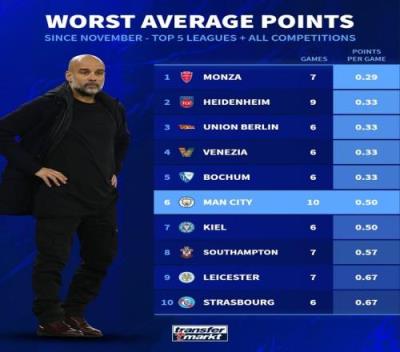 体育资讯12月17日报道宣称 德国转会市场统计了五大联赛球队11月以来的场均积分,并列出积分最少榜单,曼城场均拿到0.5分第六少。