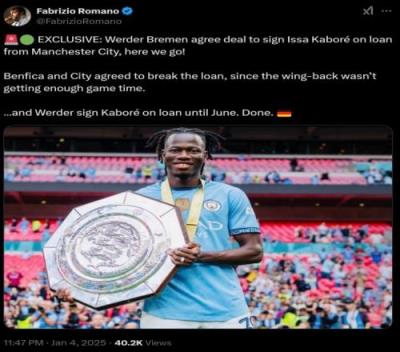 体育资讯1月4日报道宣称 名记罗马诺独家消息,不莱梅和曼城已经达成协议,将以租借形式引进23岁的后卫卡博雷,Here we go!