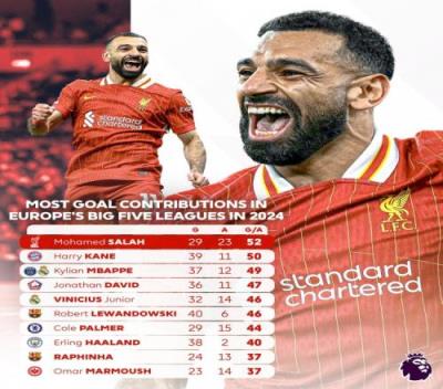 五大联赛年度参与进球榜:萨拉赫52球居首,凯恩第二、姆巴佩第三