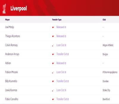利物浦离队球员: