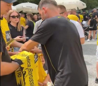 体育资讯8月5日报道宣 多特官方更新社媒动态,晒出新援为球迷签名的视频。