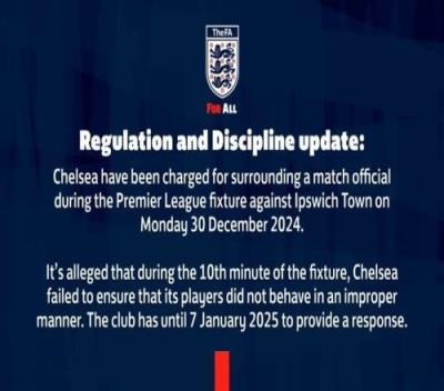 英足总指出,在此前切尔西对阵伊普斯维奇的比赛中,切尔西未能在第10分钟确保球员不出现不当行为,俱乐部必须要在2025年1月7日之前做出回应。