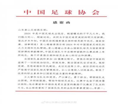 对此,泰山俱乐部也回复称:“山东泰山足球俱乐部收到中国足球协会感谢函,感谢俱乐部在2024年对国家队的大力支持与无私奉献。这份肯定是对俱乐部工作的激励,更是鞭策我们未来继续为中国足球事业贡献力量的动力,我们将始终与国家队并肩,为中国足球的美好明天共同努力!”