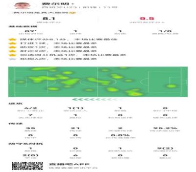 21次传球、20次成功,成功率95%