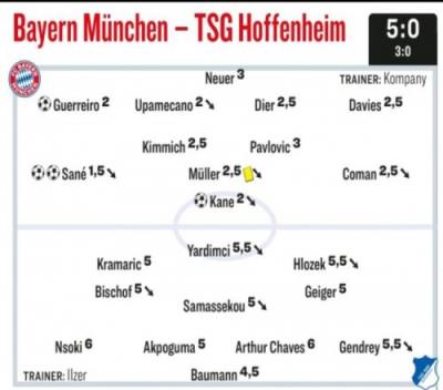 体育资讯1月16日报道宣称 在本轮德甲,拜仁5-0大胜霍芬海姆,《踢球者》也为拜仁球员本场表现做出评分,其中本场萨内梅开二度、凯恩传射建功,均获得高分,以下为具体情况(德媒评分1分最高,6分最低):