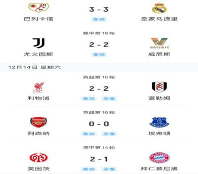 体育资讯12月15日报道宣称 今天的联赛冷门频出,多支出战的豪门均未赢球。