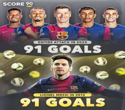 Score90指出,莱万、拉菲尼亚、亚马尔、费兰-托雷斯、法蒂2024年俱乐部+国家队总计打进91球,与梅西2012年一人进球数量相同。
