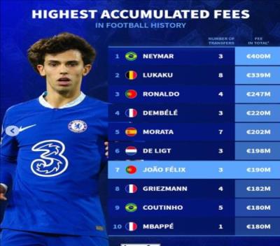体育资讯8月22日报道宣 在菲利克斯加盟切尔西后,德国转会市场晒出了球员的累积转会费排行榜,菲利克斯位列历史第7名。
