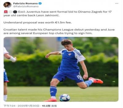 体育资讯1月30日报道宣称 据意大利记者罗马诺透露,尤文150万欧报价萨格勒布迪纳摩17岁中卫亚基罗维奇。
