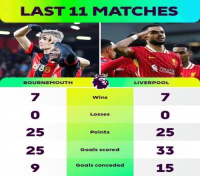 英超官方晒出两队的数据海报,预热这场比赛,伯恩茅斯和利物浦近11场英超比赛都拿到25分。