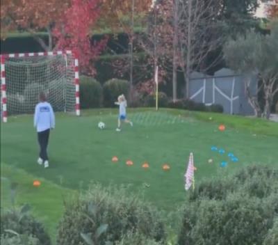 格列兹曼的妻子埃里卡-乔佩雷纳在社媒上分享了一段温馨视频,展示了格列兹曼在家中花园指导孩子踢球的画面。