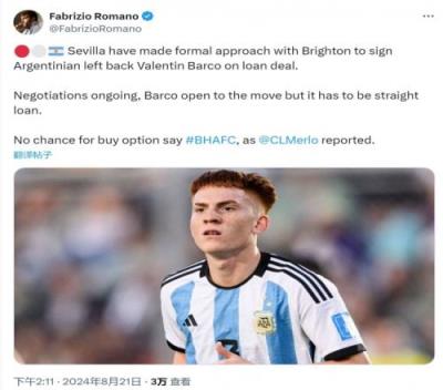 罗马诺指出,塞维利亚对阿根廷左后卫瓦伦丁-巴尔科感兴趣,有意将其租借至阵中,已就此与布莱顿正式接洽,两家俱乐部的谈判正在进行中,巴尔科对加盟塞维利亚抱开放态度。但交易方式必须是单纯租借,布莱顿不允许在协议中设置选择买断条款。