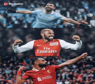 这三人分别是:阿圭罗(275场184球)、亨利(258场175球)萨拉赫(277场170球)
