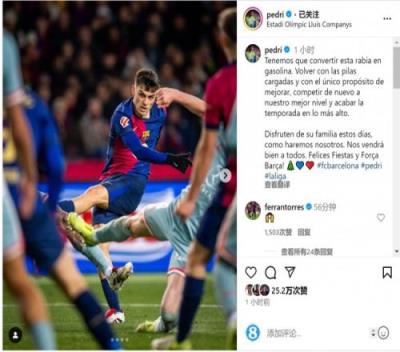 佩德里在社交媒体上晒出比赛照片,并写道:“我们必须化愤怒为动力,带着充满能量的电池回来,我们唯一的目的就是不断进步,再次在比赛中展现出我们最高的水平,并以良好的成绩结束这个赛季。”