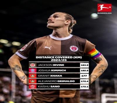 体育资讯1月2日报道宣称 德甲官方统计了球员本赛季的跑动距离,并列出榜单,圣保利中场杰克逊-欧文居首,基米希、扎卡排名二三位。
