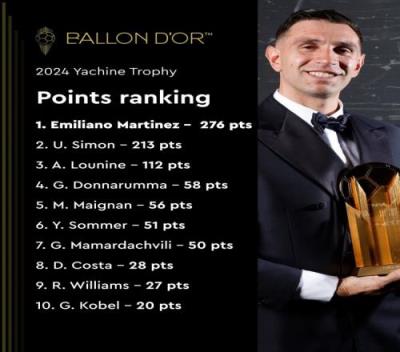 体育资讯11月9日报道宣称 阿根廷门将马丁内斯获得2024年雅辛奖,金球奖官方公布了投票分数,马丁内斯获得276分,第二名乌奈-西蒙213分。