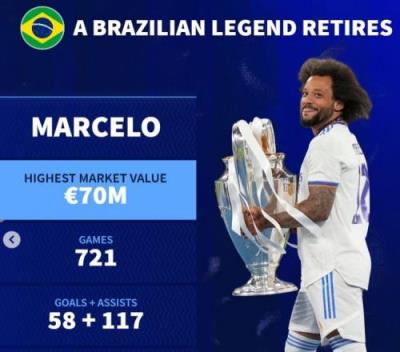 数据统计显示,36岁的马塞洛生涯最高德转身价达到7000万欧元,共计721场贡献58球117助攻。转会市场统计马塞洛生涯共计28冠,其中随皇马赢得25冠。