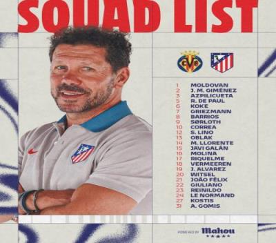 马竞客战比利亚雷亚尔大名单