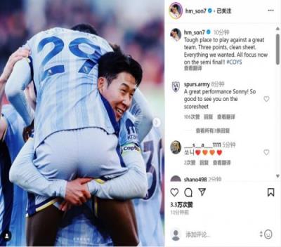 本场比赛孙兴慜一次造乌龙还有一次助攻,赛后他也在个人社媒晒出与队友相拥庆祝的照片,配文写道:“一个艰难的客场面对一支出色的球队,拿下三分,完成零封,这是我们全部想要的,现在集中注意在联赛杯半决赛。”