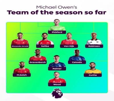 体育资讯1月4日报道宣称 英超赛程已经过半,英格兰名宿欧文评选出了他心目中的赛季至今最佳阵容。其中,萨拉赫、范迪克领衔,帕尔默、赫拉芬贝赫、凯塞多搭档中场,阿诺德、萨利巴在列。