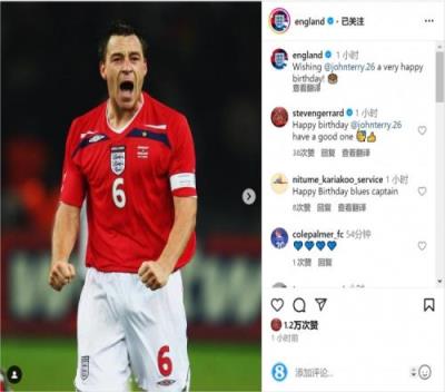 英格兰队官方社媒晒出特里效力球队的照片,并配文:“祝特里生日快乐!”
