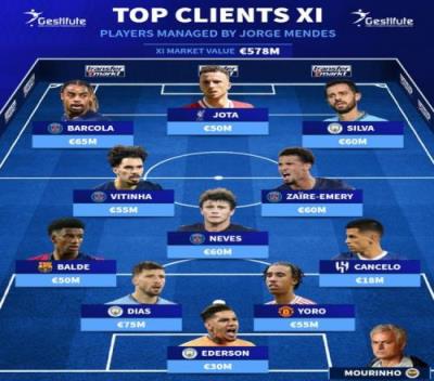 体育资讯12月30日报道宣称 门德斯在不久前获得了环足奖年度最佳经纪人奖,《转会市场》也统计了他麾下的最贵阵容。