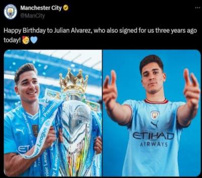 体育资讯1月31日报道宣称 今天是阿根廷前锋阿尔瓦雷斯25岁生日,同时也是他三年前签约曼城的纪念日。曼城官推也晒照为旧将送上生日祝福。