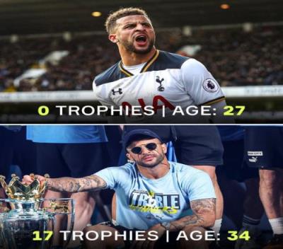 据统计,沃克27岁时还是0冠,离开曼城时已经夺得17个冠军。